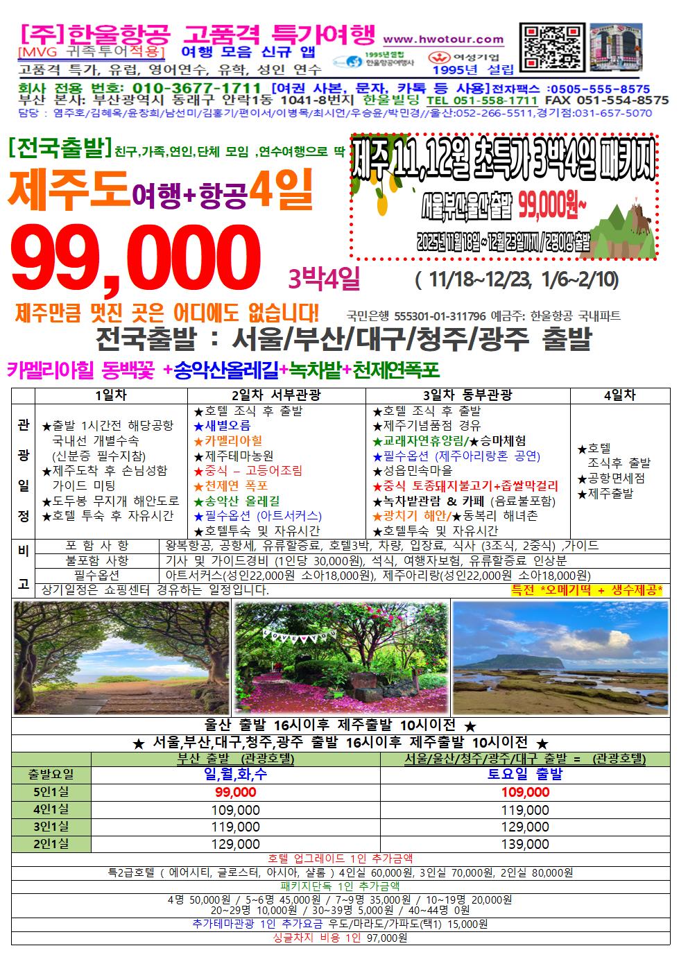 [전국 출발] 제주도 초초특가 3박 4일 즐겁게 제주도 생활을 느껴보시면 어떨까요? 99,000원 상품