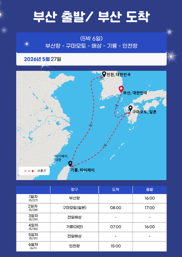 2026년 5월27일~6월1일 대만·일본 5박 6일 “바다 위에서 시작되는 가장 품격 있는 여행” [럭셔리 크루즈|구마모토·기륭|부산출발/인천도착]