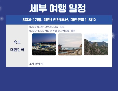 - 여행 일정은 계약 체결 시 예상하지 못한 부득이한 사정 등이 발생하는 경우 여행자의 사전 동의를 거쳐 변경될 수 있음을 양지하여 주시기 바랍니다.